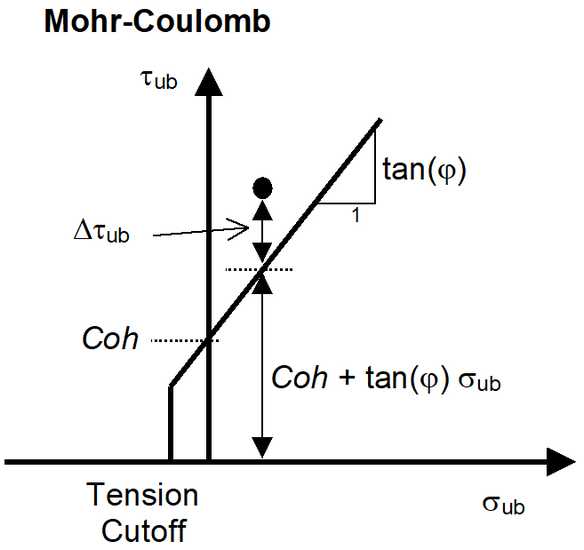 In elastic analysis the maximum ubiquitous-plane shear and normal stress can be used with the Mohr-Coulomb strength criterion to estimate the amount of slip due to over-stressing, on a fault, joint set or bedding plane at the specified orientation. Since these parameters are orientation dependant, this criterion is representative for anisotropic rock mass stability.